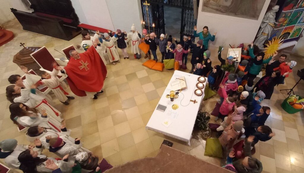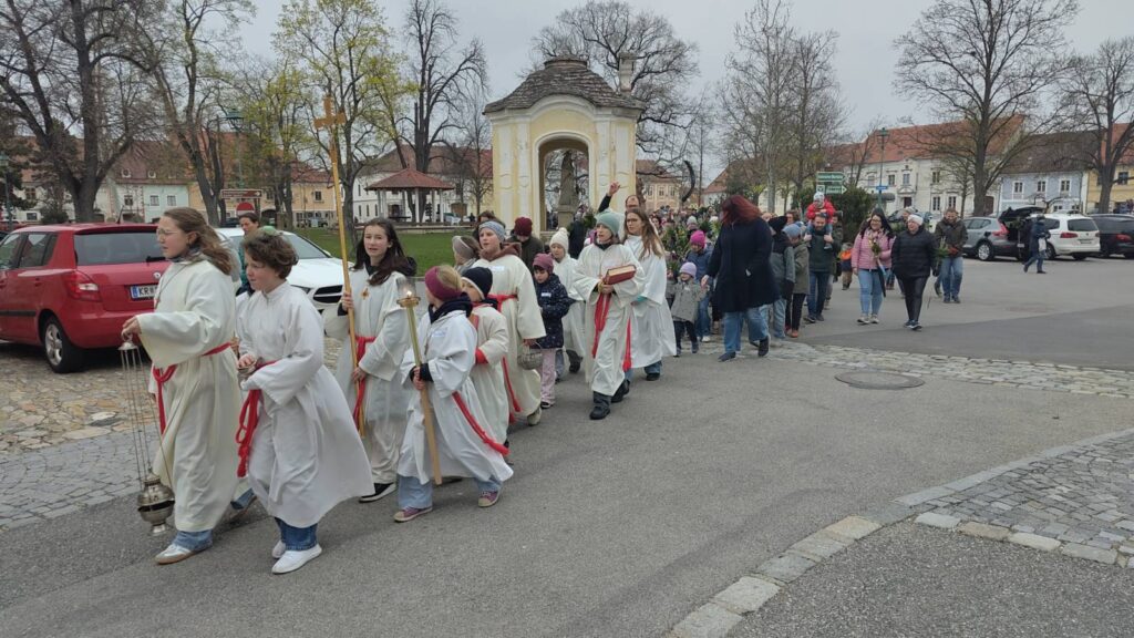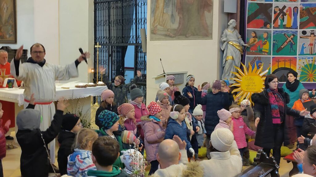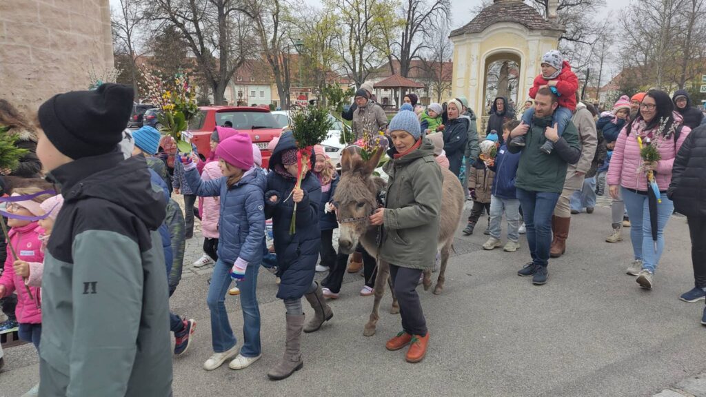 Nach der gemeinsamen Palmbuschenweihe im Park zog hinter den – schon zur lieben Tradition gewordenen – Eseln ein wirklich große Kinderschar direkt in den Pfarr- und Kultursaal ein, um dort einen Kinderwortgottesdienst zu feiern.