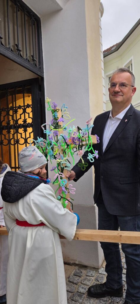 Auf das Leiden Jesu, seine Ängste, seine Verletzungen aber auch auf die Hoffnung und dass es Menschen gab, die ihm auf seinem Kreuzweg geholfen haben und die bei ihm geblieben sind – bis über den Tod hinaus. So hat er uns gezeigt, dass die Liebe stärker ist als der Hass und der Tod niemals das letzte Wort hat sondern die Hoffnung.Um dies auszudrücken und zu verbildlichen haben die über 50 Kinder ein Holzkreuz mit selbgebastelten Blumen aus „Pfeifenputzern“ geschmückt und so wurde aus dem Zeichen des Leides – dem Kreuz – ein Zeichen des Heiles und der Hoffnung.